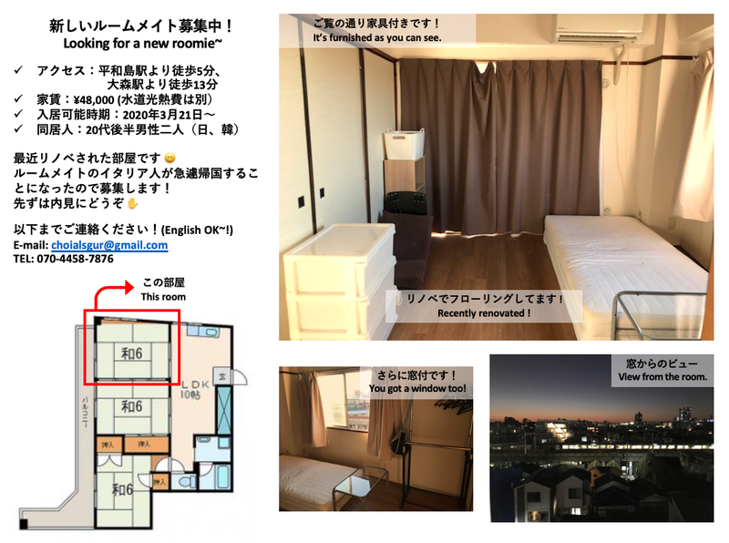 ✔︎ 前のイタリア人のルームメイトがコロナで急遽帰国したため、新しく募集してます。